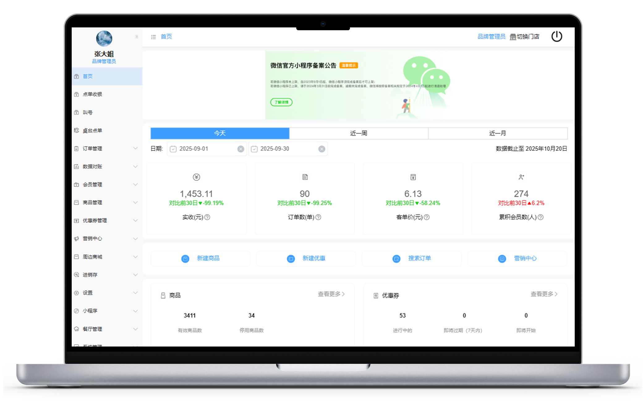 点单和商城统一会员体系,留存、复购、提升客单价;积分、券、秒杀,完整营销体系